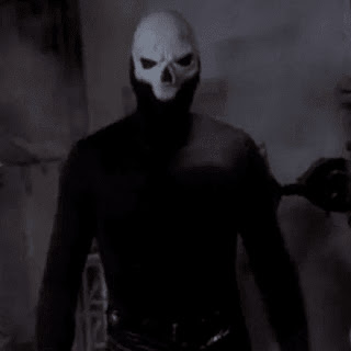 FISIONOMÍA Y ATUENDO: Joven completamente vestido de negro, a excepción de una pálida máscara con forma de calavera sin mandíbula inferior.